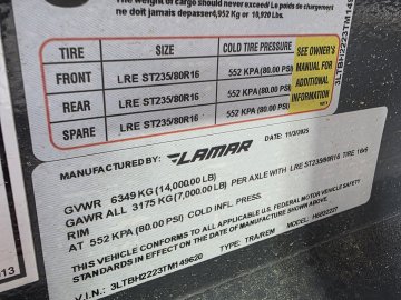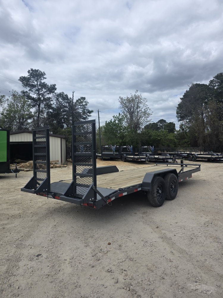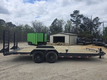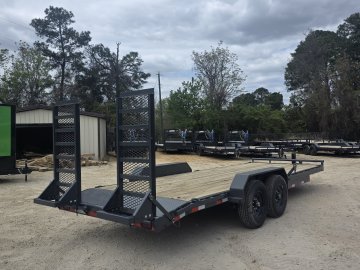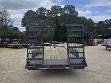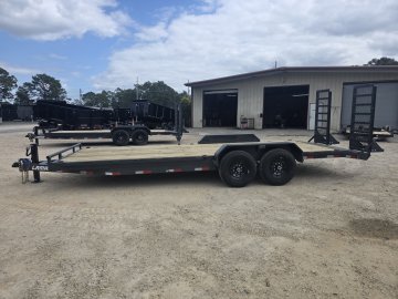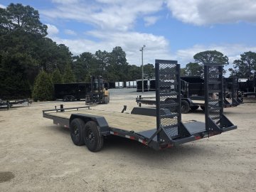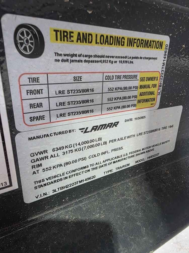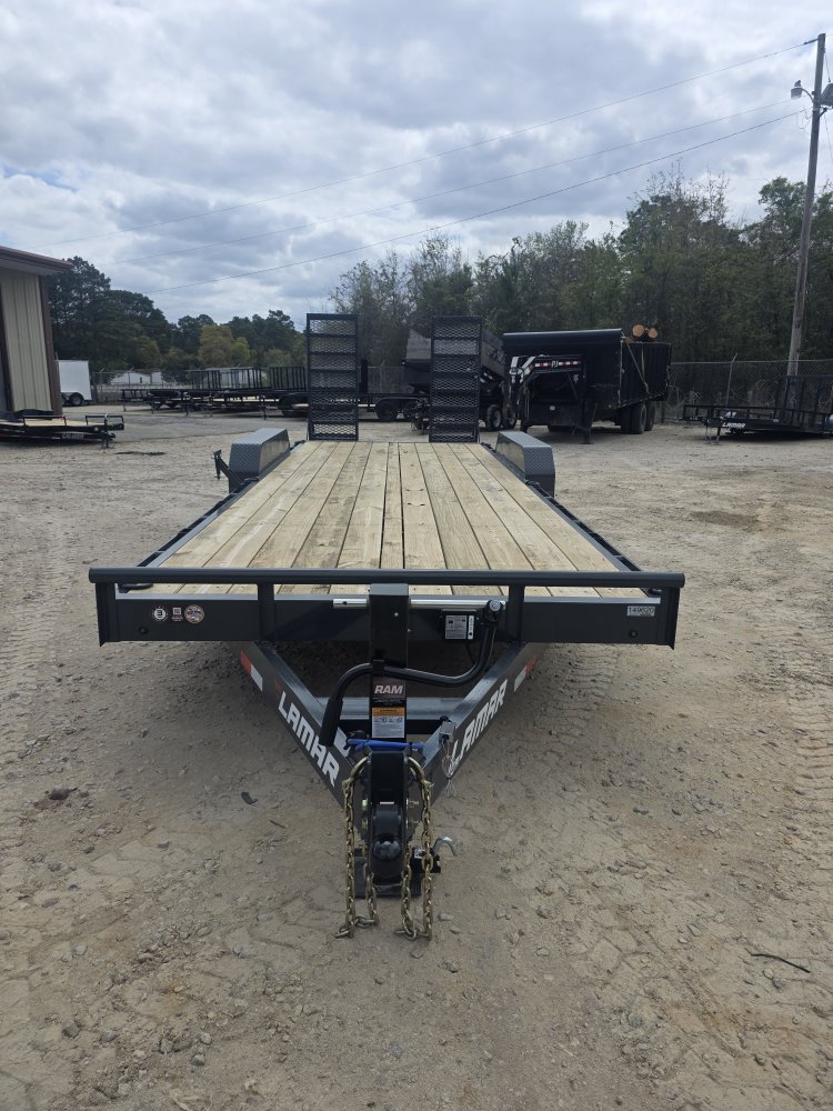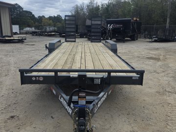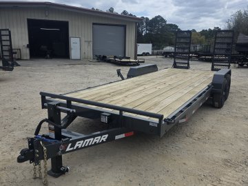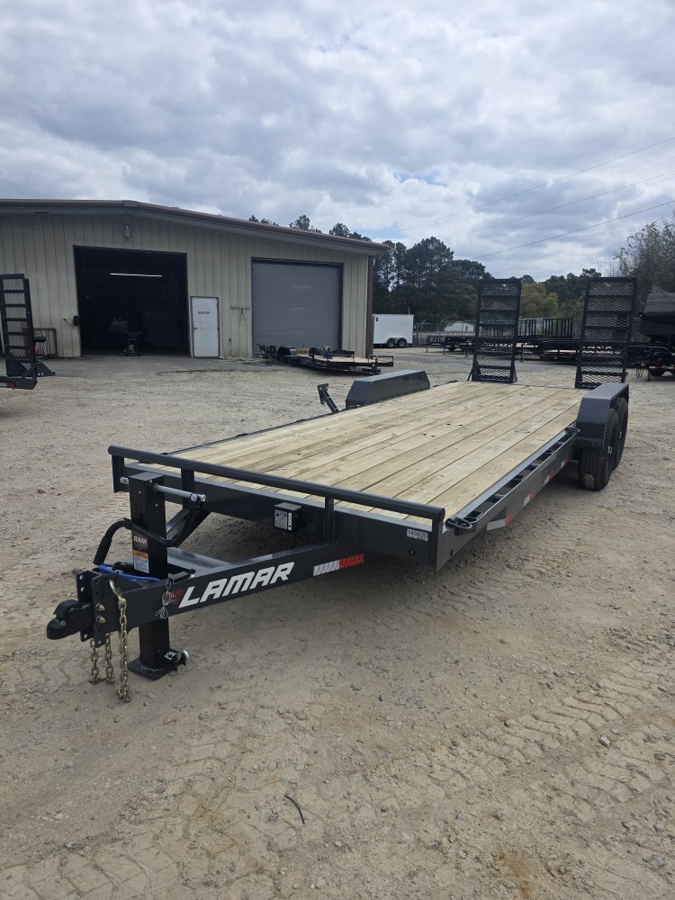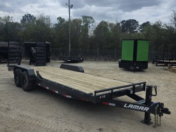 The Lamar Trailer Model H6832227 83x22 14k equipment trailer is a robust tandem-axle equipment hauler built for heavy-duty hauling tasks. With a 14,000 lb GVWR and dual 7,000 lb axles with electric brakes, it provides roughly 10,900 lb of payload capacity, making it ideal for transporting tractors, skid steer, construction machinery and other large equipment. The trailer rides on 235/80R16 radial tires and features a 6” channel steel frame with 16” crossmembers, treated yellow pine decking, and a rugged power-coat finish for corrosion resistance. Standard towing hardware includes an adjustable 2 5/16” coupler, 10,000 lb drop-leg jack, and a wrap-tongue design, while loading is aided by heavy-duty stand up ramps, plus stake pockets, rub rails, and multiple weld-on D-rings for secure tie-downs; all backed by Lamar’s build quality and trailer warranty.