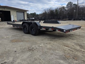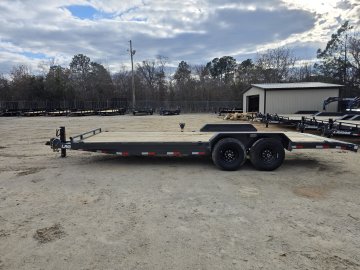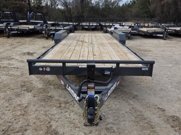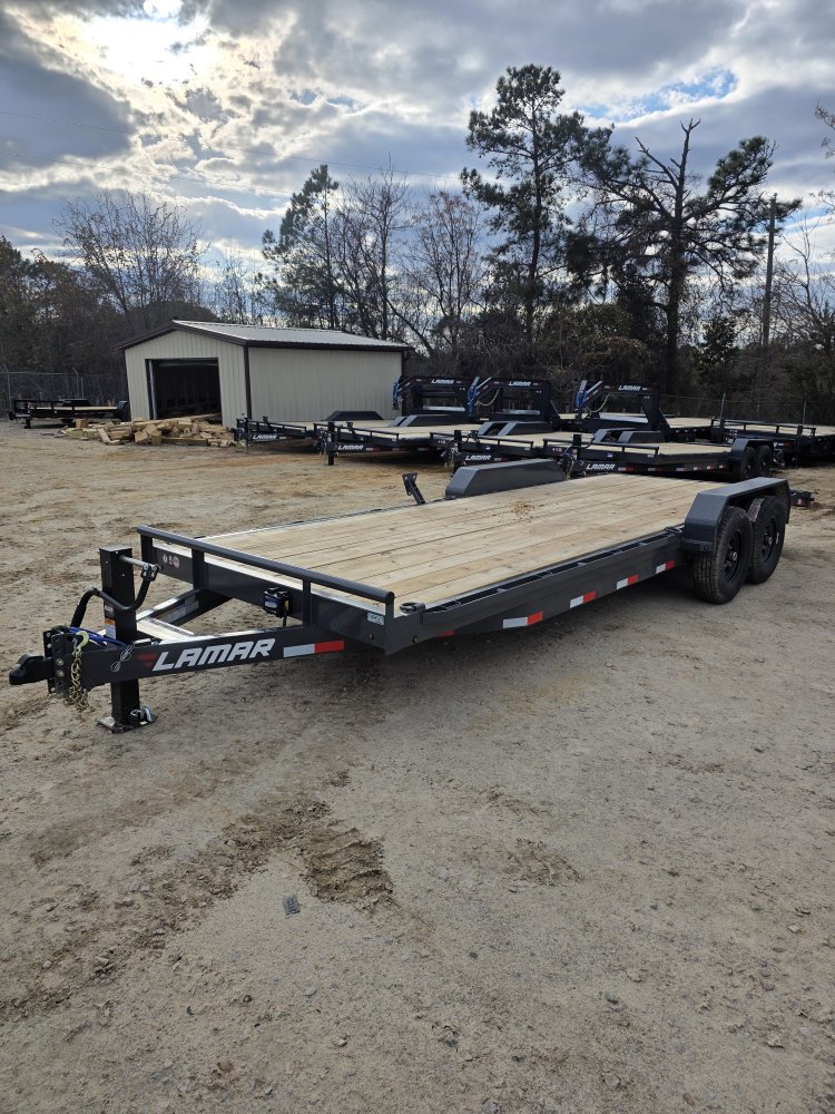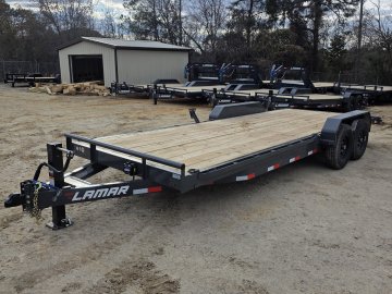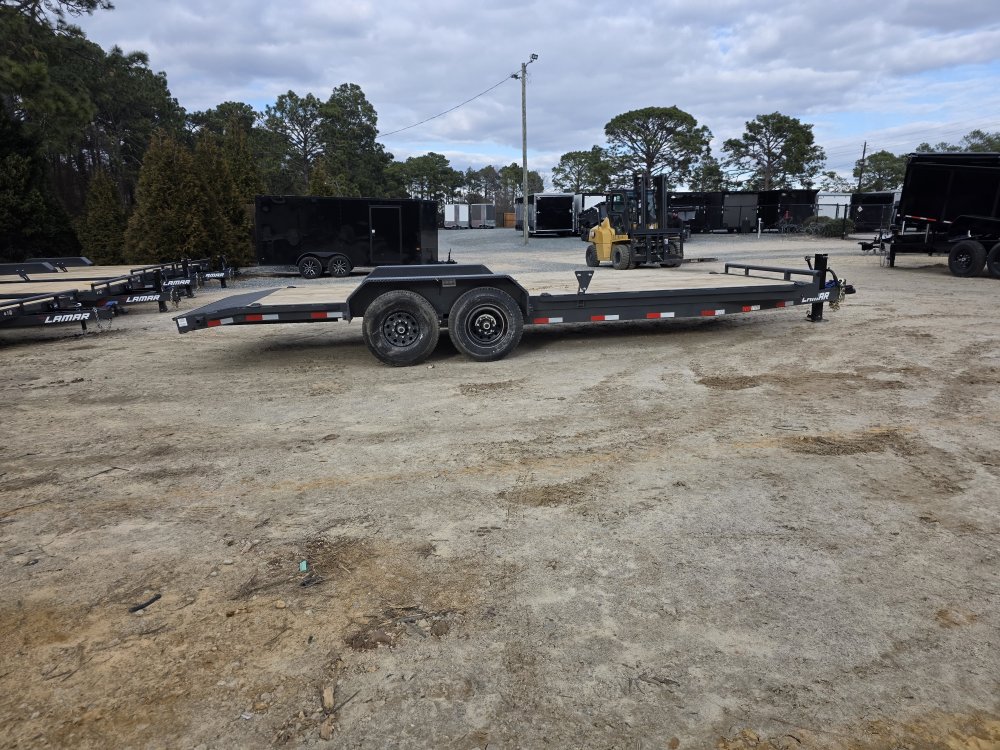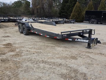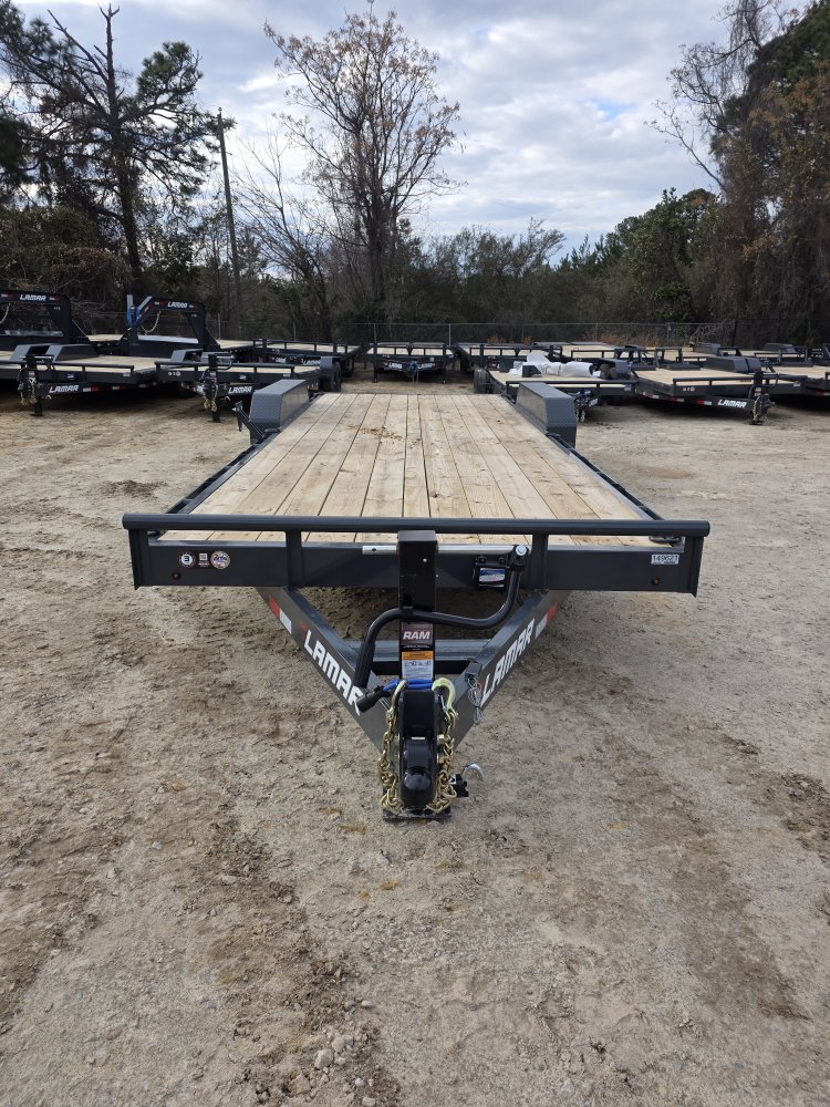 The Lamar Trailer Model H6832227 83x22 14k equipment trailer is a robust tandem-axle equipment hauler built for heavy-duty hauling tasks.  With a 14,000 lb GVWR and dual 7,000 lb axles with electric brakes, it provides roughly 10,900 lb of payload capacity, making it ideal for transporting tractors, skid steer, construction machinery and other large equipment.  The trailer rides on 235/80R16 radial tires and features a 6” channel steel frame with 16” crossmembers, treated yellow pine decking, and a rugged power-coat finish for corrosion resistance. Standard towing hardware includes an adjustable 2 5/16” coupler, 10,000 lb drop-leg jack, and a wrap-tongue design, while loading is aided by heavy-duty stand up ramps, plus stake pockets, rub rails, and multiple weld-on D-rings for secure tie-downs; all backed by Lamar’s build quality and trailer warranty.