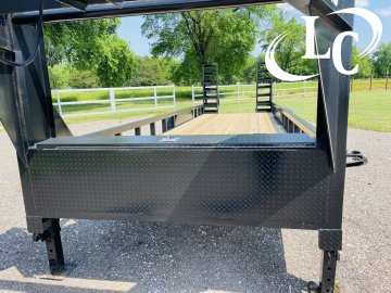 10ply Radial Tires (ST235X80R-16 / 8Hole / PSI 80), 12" Ibeam Gooseneck Frame, 12k Ram Jack, 2 - Brakes, 2nd - 12k Ram Jack, 3" Crossmembers every 16", 3X3 - 11ga Square Tube, 6" Channel Frame, 7k Dexter Axles, Box Ramps, Diamond Fenders, Led Lights, Spare Mount, Spare Tire, Treated Lumber