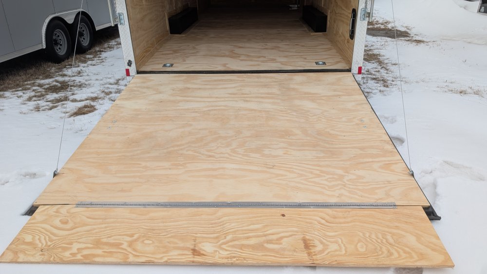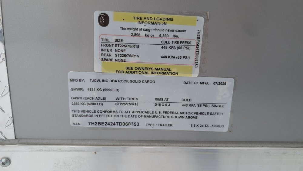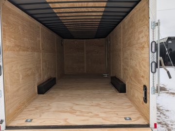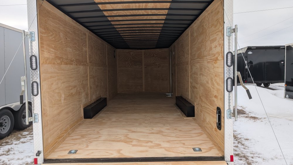 This heavy-duty enclosed trailer is built to last with a robust 6" steel tube main frame and 16" on-center spacing for the roof bows, floor cross members, and sidewalls, ensuring superior structural integrity. It features a durable ¾" plywood floor and 3/8" plywood walls, plus a Therma Cool ceiling liner for climate management. Access is easy via a 36" side door with a flush lock and an ATP covered stepwell, illuminated by a 12-volt LED dome light. For secure transport, it includes electric brakes on both axles, a 7-way Bargman plug, and E-Z Lube hubs on its silver mod wheels. The V-nose design, 24" stone guard, and aluminum fenders add to its functionality and protection. Inside, you'll find 4 floor mount D-rings to secure your cargo, and a no-show beavertail for smooth loading. All lighting is LED for reliability.