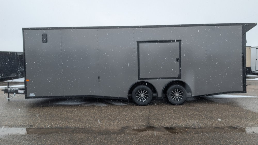 Features a striking Black Out Package, highlighted by all black trim and sleek black ATP fenders. It boasts a black stone guard and V-nose for a unified aesthetic, complemented by black ATP stepwells on 8.5' wide models. The look is completed with black barlocks, aluminum wheels with black inlay, and black aluminum side vents, creating a bold and cohesive appearance.