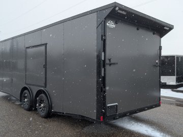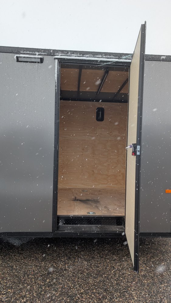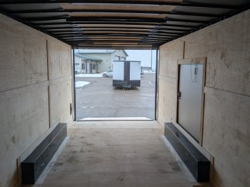 This heavy-duty enclosed trailer is built to last with a robust 6" steel tube main frame and 16" on-center spacing for the roof bows, floor cross members, and sidewalls, ensuring superior structural integrity. It features a durable ¾" plywood floor and 3/8" plywood walls, plus a Therma Cool ceiling liner for climate management. Access is easy via a 36" side door with a flush lock and an ATP covered stepwell, illuminated by a 12-volt LED dome light. For secure transport, it includes electric brakes on both axles, a 7-way Bargman plug, and E-Z Lube hubs on its silver mod wheels. The V-nose design, 24" stone guard, and aluminum fenders add to its functionality and protection. Inside, you'll find 4 floor mount D-rings to secure your cargo, and a no-show beavertail for smooth loading. All lighting is LED for reliability.