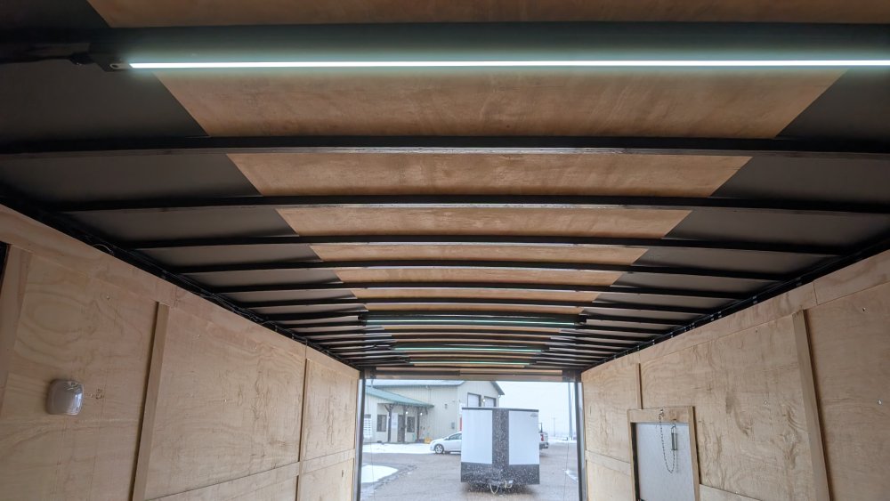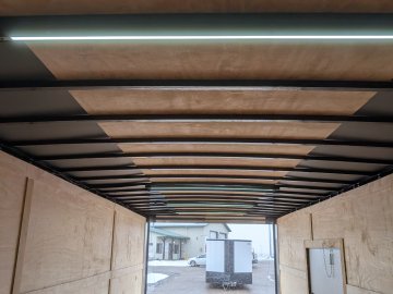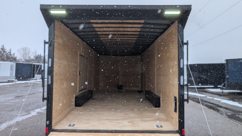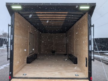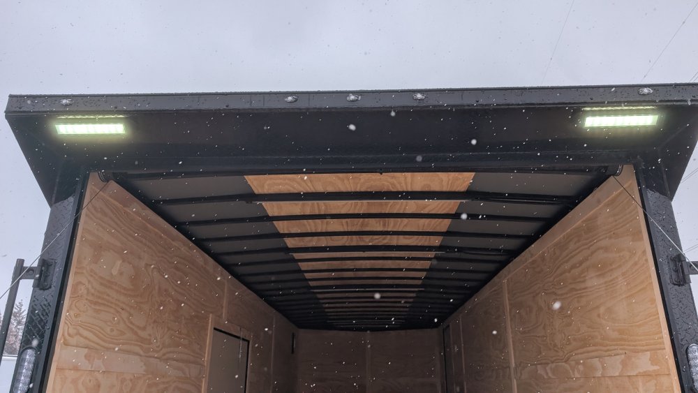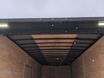 This trailer comes with an integrated Rear Spoiler with a Light Package, powered by a 12-volt battery with a dedicated box. The interior is brightly lit by four 48" 12-volt slim LED lights controlled by a wall switch. For exterior illumination, it features two 13" 12-volt LED flood lights on the spoiler and two additional 13" 12-volt LED flood lights on the passenger side.