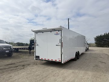NATM Certified | 2"x6" Square Tube Frame | Tandem 7,000 lbs Axles - EZ Lube Hubs | Electric Brakes On Both Axles| 0.08" Polycore Siding | 16" OC Frame Cross-Members | 16" OC Wall Cross-Members | 16" OC Roof Cross-Members | (4) D-Rings On Floor | Tail Spoiler Package w/ Loading Lights w/ Outside Switch | 2 5/16" Bulldog Coupler | 7,000# Jack | Single Piece Aluminum Roof | Interior Height: 7' | 3/4" Plywood: Ramp & Floor | 3/8" Plywood: Walls | LED Lights: Running, Tail, Lic. Plate & Int Lights w/ Switch | Tire/Wheel - ST225/75R15 - 10ply | Custom Fabrication On All Headers and Corners Post | Side Door Dimensions: 36"x78" | Ramp Gate / Barn Doors On Rear Of Trailer (Ramp Gate Dimensions: 90"Wx80"H) | 1 Year Manufacturer Workmanship Warranty | 5 Year Polycore Warranty