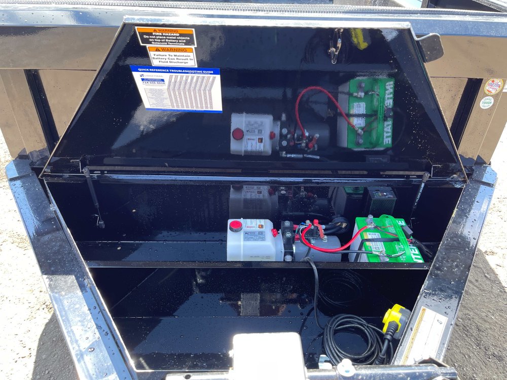 2-Way Spreader Gate, Rear Slide-In Ramps [7-ft x 16-in] & Support Stands, Mesh Tarp Kit w/Pull Bar & Four Weld-On D-Rings, Scissor Hoist w/HD KTI Pump & 5 Amp Battery Charger, 2-5/16-in Adjustable Coupler