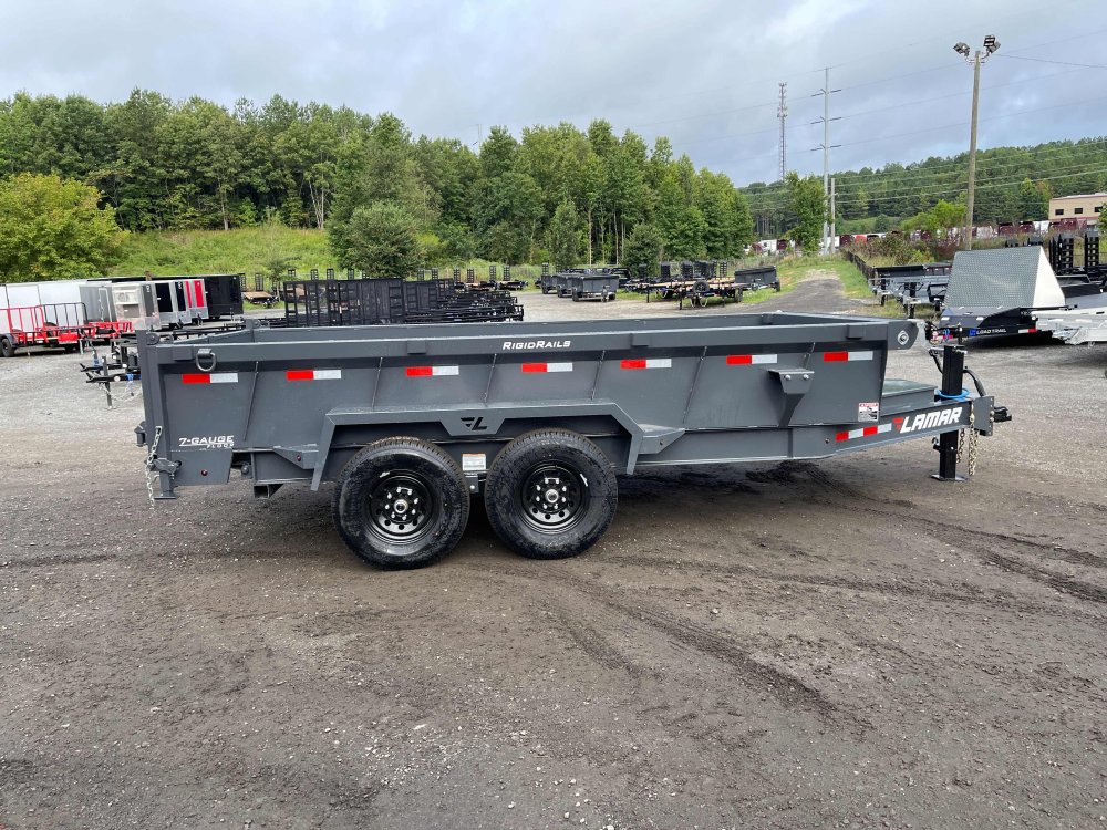 New 2026 Lamar 7ft x 14ft 14k Tandem Axle Bumper Pull Dump w/2ft walls & 2-Way Spreader Gate (Lamar Gray) High Quality Trailer Lamar Gray (w/ Primer) 2 - 7000-Lb Dexter Standard Spring Suspension w/EZ Lube Axle(s) (10PR Tires) Electric Forward Self-Adjusting Brakes on 2 Axles Steel Construction w/16-in Crossmembers (7-ga Steel Floor) 1 - Spring Loaded Drop Leg 10000 lb (1-Speed) Jack Steel Smooth Fenders (Weld-On) LED Exterior Lighting Pkg (w/Cold Weather Harness) 2-Way Spreader Gate Rear Slide-In Ramps [7-ft x 16-in] & Support Stands Mesh Tarp Kit w/Pull Bar & Four Weld-On D-Rings Scissor Hoist w/HD KTI Pump & 5 Amp Battery Charger 2-5/16-in Adjustable Coupler No haggle, no BS, no hidden fees, no nickel and diming. Call 770-608-6882, or visit www.georgiatraileroutlet.com Georgia Trailer Outlet 45 Carson Loop NW Cartersville, GA 30121 Contact us for warranty information.