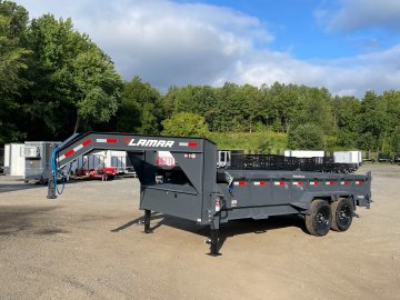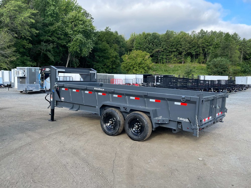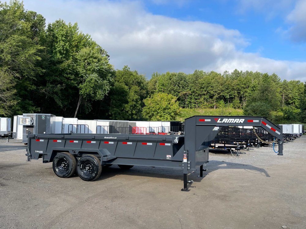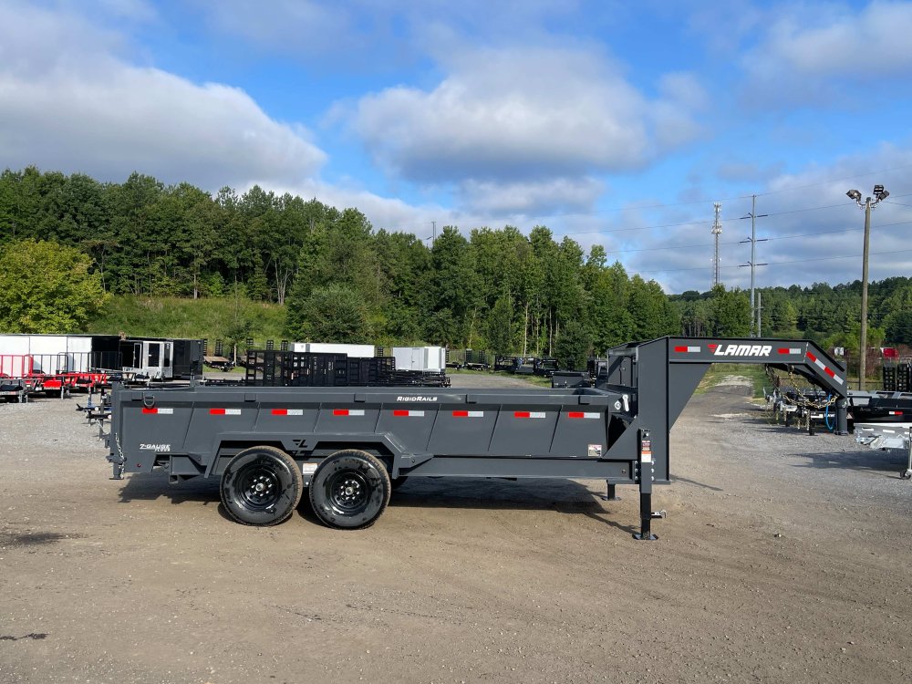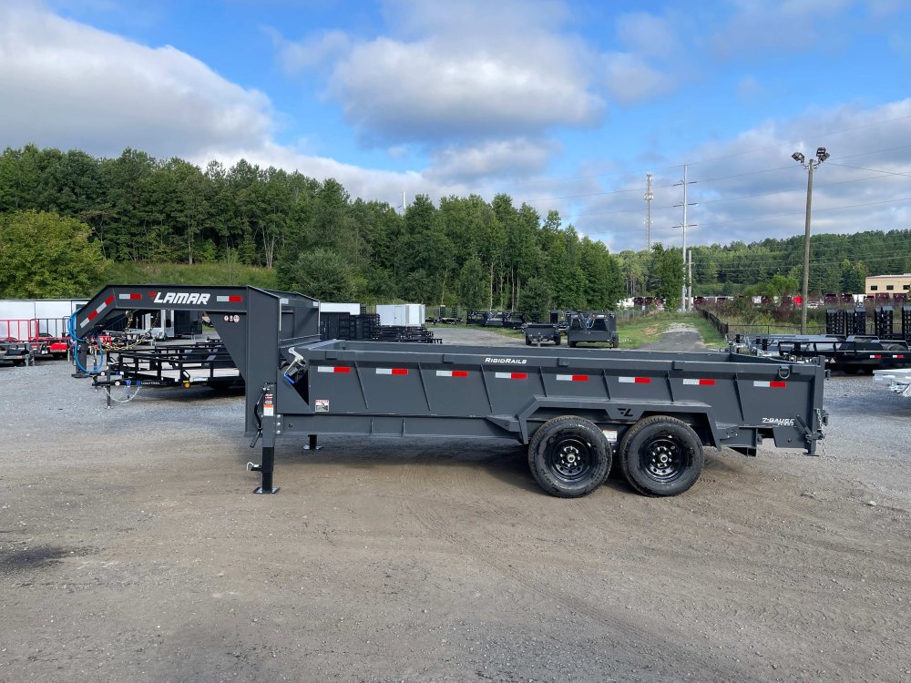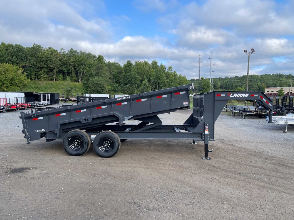 New 2026 Lamar 7ft x 16ft 14k Tandem Axle Gooseneck Dump w/2ft walls & 2-Way Spreader Gate (Lamar Gray) High Quality Trailer Lamar Gray (w/ Primer) 2 - 7000-Lb Dexter Standard Spring Suspension w/EZ Lube Axle(s) (10PR Tires) Electric Forward Self-Adjusting Brakes on 2 Axles Steel Construction w/16-in Crossmembers (7-ga Steel Floor) 2 - Spring Loaded Drop Leg 10000 lb (1-Speed) Jacks Steel Diamond Plate Fenders (Weld-On) LED Exterior Lighting Pkg (w/Cold Weather Harness) 2-Way Spreader Gate Rear Slide-In Ramps [7-ft x 16-in] Mesh Tarp Kit w/Pull Bar Scissor Hoist w/HD KTI Pump & 5 Amp Battery Charger 2-5/16-in Adjustable Coupler No haggle, no BS, no hidden fees, no nickel and diming. Call 770-608-6882, or visit www.georgiatraileroutlet.com Georgia Trailer Outlet 45 Carson Loop NW Cartersville, GA 30121 Contact us for warranty information.