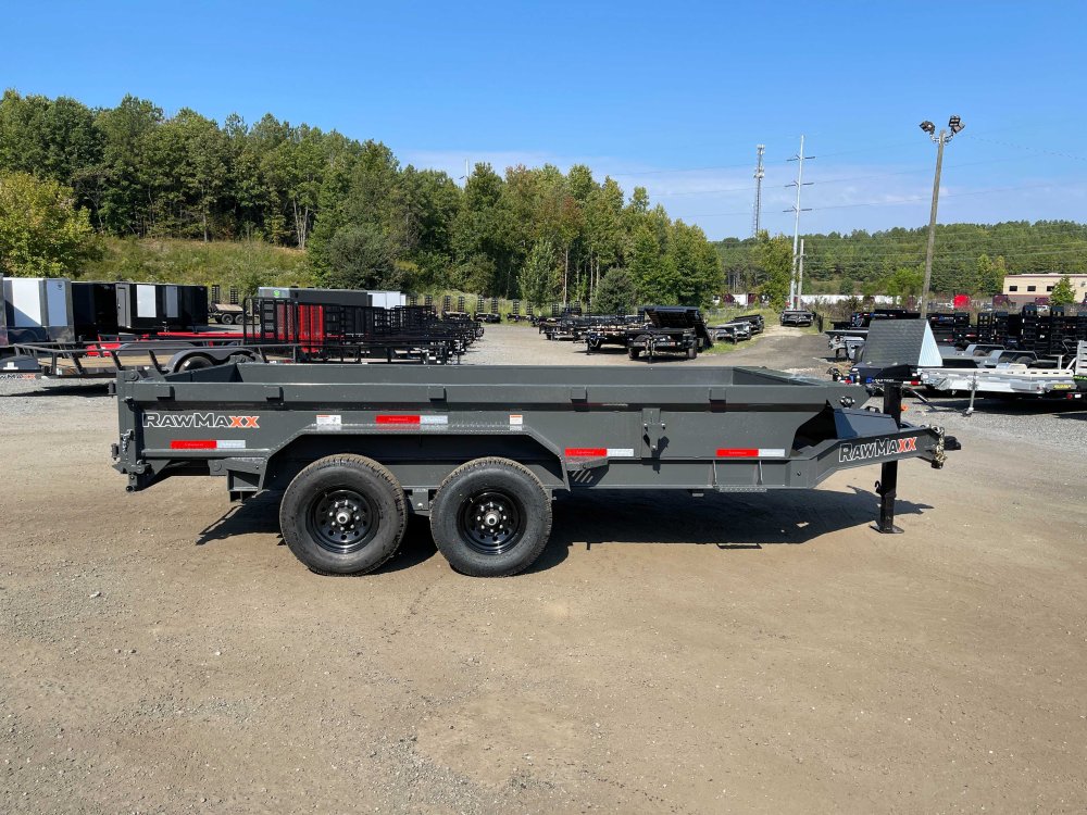 New 2026 RawMaxx 7ft x 14ft 14k Tandem Axle Bumper Pull Dump w/1.6ft walls & 2-Way Spreader Gate (Shadow Gray) High Quality Trailer Shadow Gray (w/ Primer) 2 - 7000-Lb Standard Spring Suspension w/EZ Lube Axle(s) (10PR Tires) Electric Forward Self-Adjusting Brakes on 2 Axles Steel Construction w/16-in Crossmembers (10-ga Steel Floor) 1 - Spring Loaded Drop Leg 10000 lb (1-Speed) Jack Steel Diamond Plate Fenders (Weld-On) LED Exterior Lighting Pkg (w/Cold Weather Harness) 2-Way Spreader Gate Rear Slide-In Ramps [6-ft x 16-in] Mesh Tarp Kit w/Pull Bar & Four Weld-On D-Rings Scissor Hoist w/HD KTI Pump & 5 Amp Battery Charger 2-5/16-in Adjustable Coupler No haggle, no BS, no hidden fees, no nickel and diming. Call 770-608-6882, or visit www.georgiatraileroutlet.com Georgia Trailer Outlet 45 Carson Loop NW Cartersville, GA 30121 Contact us for warranty information.