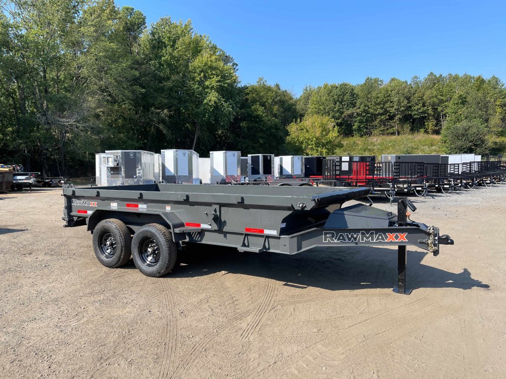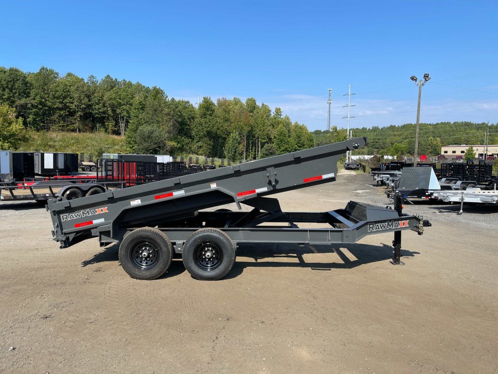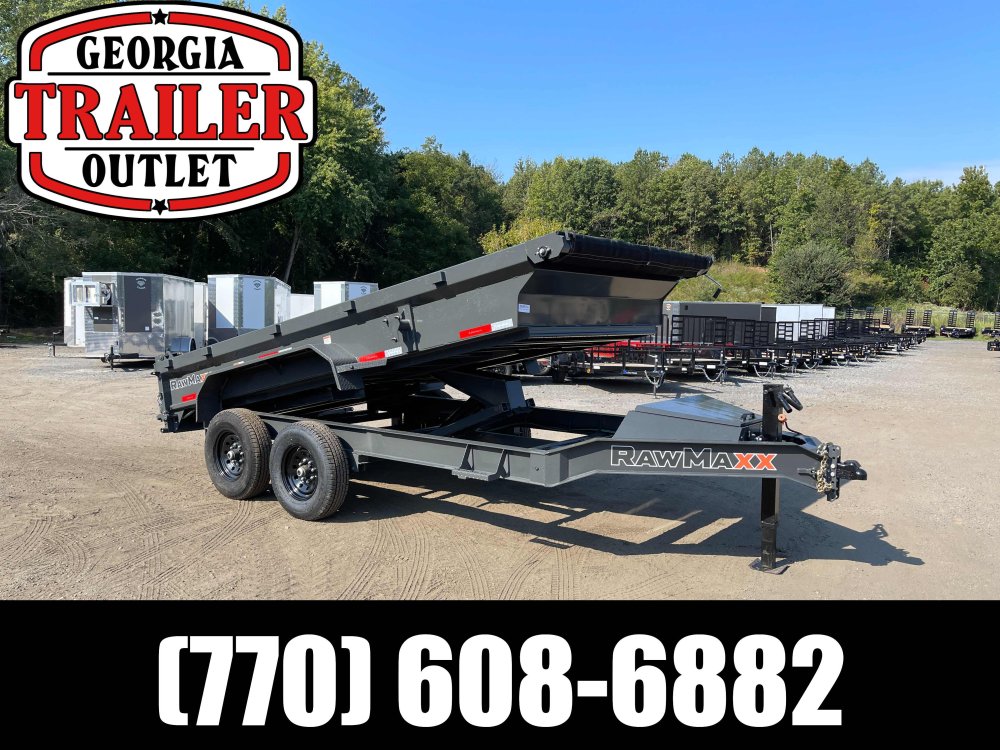 New 2026 RawMaxx 7ft x 14ft 14k Tandem Axle Bumper Pull Dump w/1.6ft walls & 2-Way Spreader Gate (Shadow Gray) High Quality Trailer Shadow Gray (w/ Primer) 2 - 7000-Lb Standard Spring Suspension w/EZ Lube Axle(s) (10PR Tires) Electric Forward Self-Adjusting Brakes on 2 Axles Steel Construction w/16-in Crossmembers (10-ga Steel Floor) 1 - Spring Loaded Drop Leg 10000 lb (1-Speed) Jack Steel Diamond Plate Fenders (Weld-On) LED Exterior Lighting Pkg (w/Cold Weather Harness) 2-Way Spreader Gate Rear Slide-In Ramps [6-ft x 16-in] Mesh Tarp Kit w/Pull Bar & Four Weld-On D-Rings Scissor Hoist w/HD KTI Pump & 5 Amp Battery Charger 2-5/16-in Adjustable Coupler No haggle, no BS, no hidden fees, no nickel and diming. Call 770-608-6882, or visit www.georgiatraileroutlet.com Georgia Trailer Outlet 45 Carson Loop NW Cartersville, GA 30121 Contact us for warranty information.