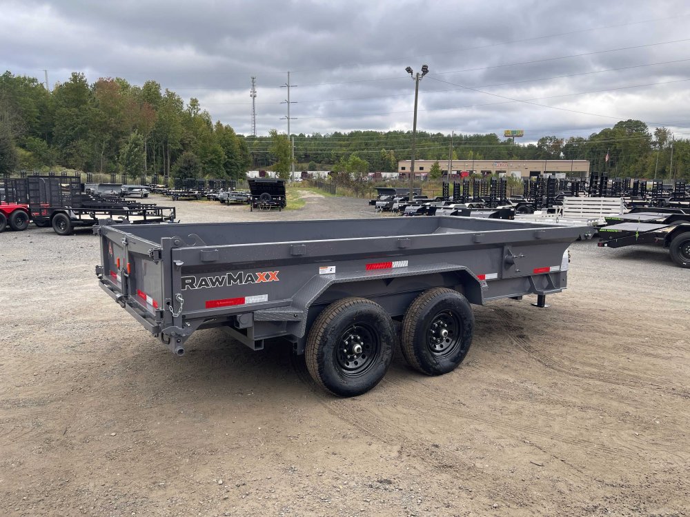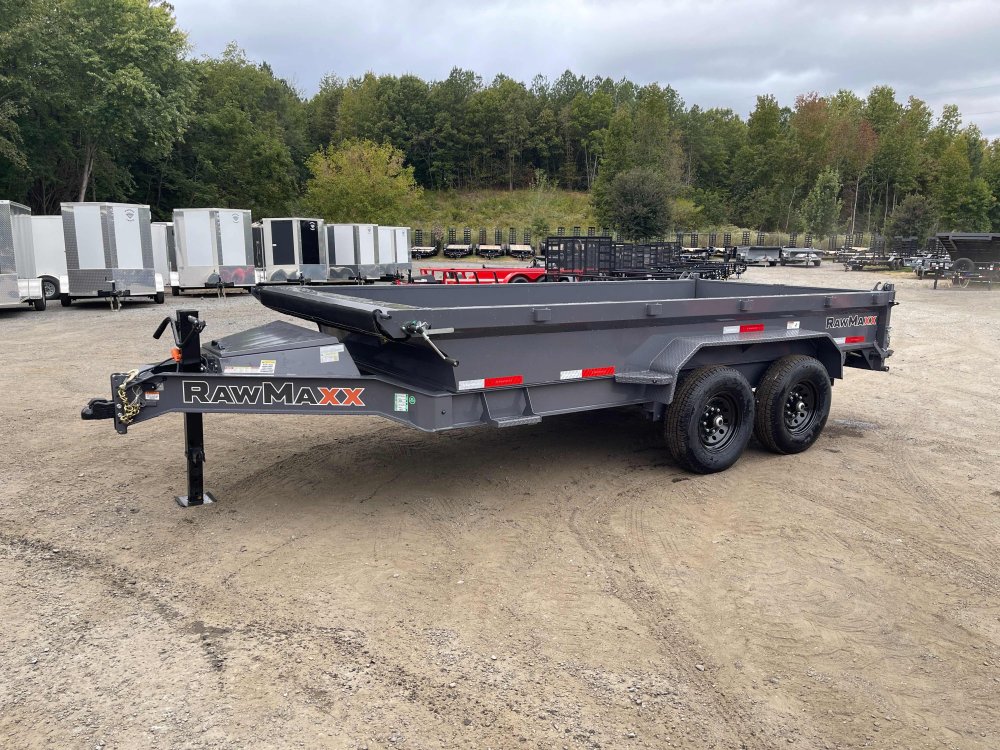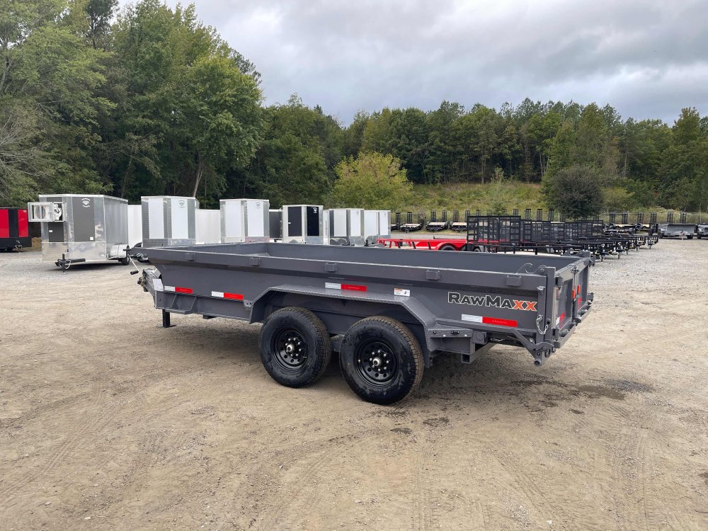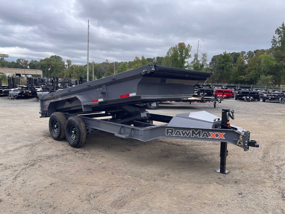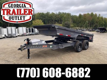 New 2026 RawMaxx 7ft x 14ft 14k Tandem Axle Bumper Pull Dump w/1.6ft walls & 2-Way Spreader Gate (Shadow Gray) High Quality Trailer Shadow Gray (w/ Primer) 2 - 7000-Lb Standard Spring Suspension w/EZ Lube Axle(s) (10PR Tires) Electric Forward Self-Adjusting Brakes on 2 Axles Steel Construction w/16-in Crossmembers (9-ga Steel Floor) 1 - Spring Loaded Drop Leg 10000 lb (1-Speed) Jack Steel Diamond Plate Fenders (Weld-On) LED Exterior Lighting Pkg (w/Cold Weather Harness) 2-Way Spreader Gate Rear Slide-In Ramps [6-ft x 16-in] Mesh Tarp Kit w/Pull Bar & Four Weld-On D-Rings Scissor Hoist w/HD KTI Pump & 5 Amp Battery Charger 2-5/16-in Adjustable Coupler No haggle, no BS, no hidden fees, no nickel and diming. Call 770-608-6882, or visit www.georgiatraileroutlet.com Georgia Trailer Outlet 45 Carson Loop NW Cartersville, GA 30121 Contact us for warranty information.