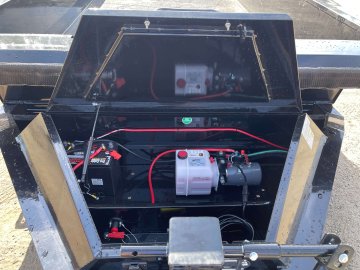 2-Way Spreader Gate, Rear Slide-In Ramps [6-ft x 16-in], Mesh Tarp Kit w/Pull Bar & Four Weld-On D-Rings, Scissor Hoist w/HD KTI Pump & 5 Amp Battery Charger, 2-5/16-in Adjustable Coupler