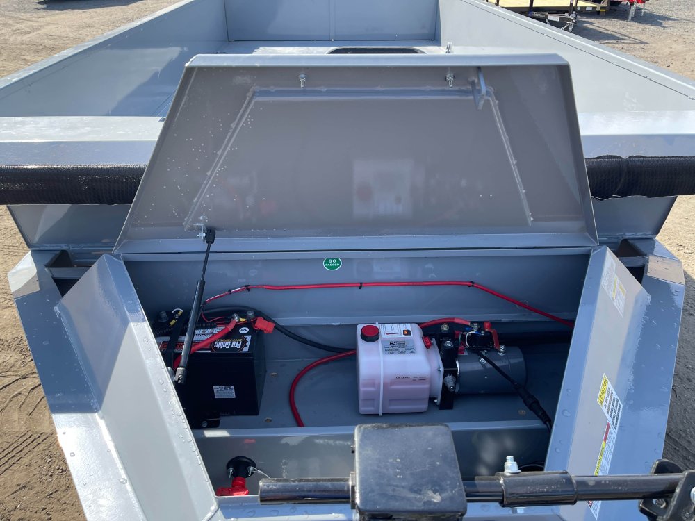 2-Way Spreader Gate, Rear Slide-In Ramps [5-ft x 12-in], Mesh Tarp Kit w/Pull Bar & Four Weld-On D-Rings, Scissor Hoist w/HD KTI Pump & 5 Amp Battery Charger, 2-5/16-in Adjustable Coupler