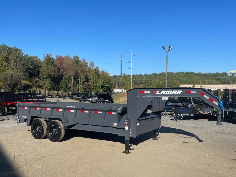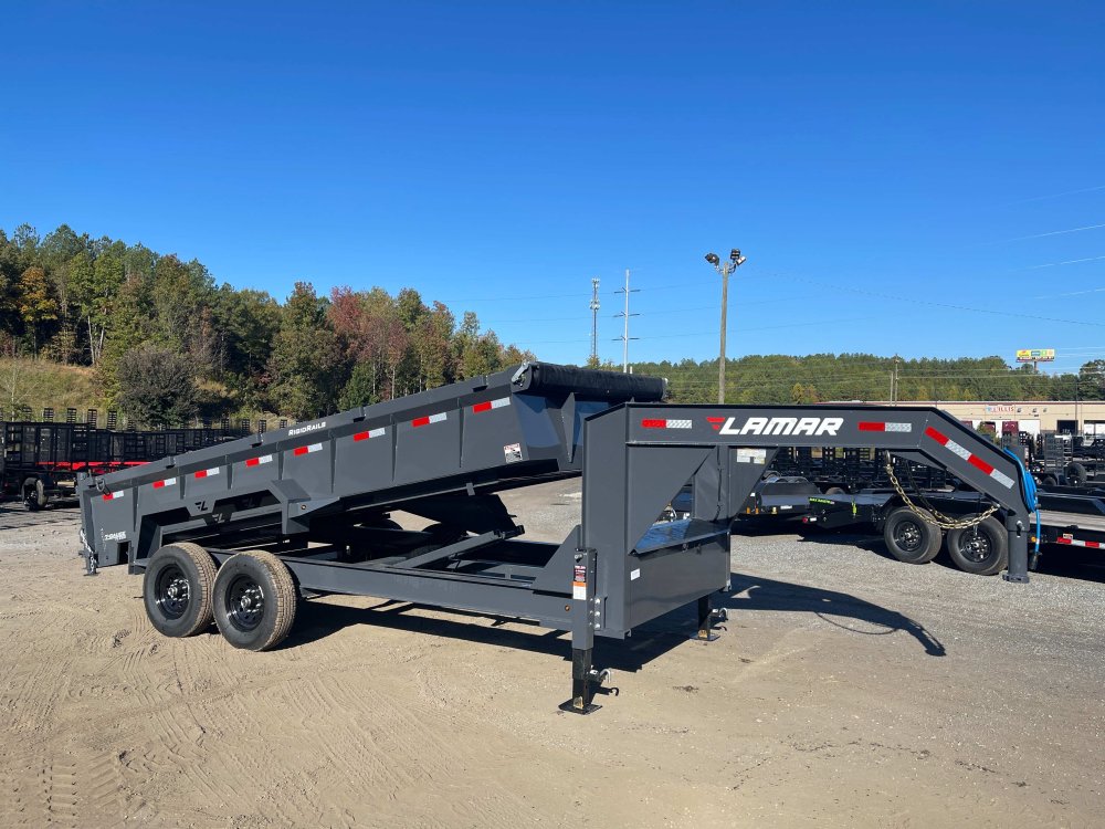 New 2026 Lamar 7ft x 16ft 14k Tandem Axle Gooseneck Dump w/2ft walls & 2-Way Spreader Gate (Lamar Gray) High Quality Trailer Lamar Gray (w/ Primer) 2 - 7000-Lb Dexter Standard Spring Suspension w/EZ Lube Axle(s) (10PR Tires) Electric Forward Self-Adjusting Brakes on 2 Axles Steel Construction w/16-in Crossmembers (7-ga Steel Floor) 2 - Spring Loaded Drop Leg 10000 lb (1-Speed) Jacks Steel Diamond Plate Fenders (Weld-On) LED Exterior Lighting Pkg (w/Cold Weather Harness) 2-Way Spreader Gate Rear Slide-In Ramps [5-ft x 12-in] Mesh Tarp Kit w/Pull Bar & Four Weld-On D-Rings Scissor Hoist w/HD KTI Pump & 5 Amp Battery Charger 2-5/16 25k Gooseneck Coupler No haggle, no BS, no hidden fees, no nickel and diming. Call 770-608-6882, or visit www.georgiatraileroutlet.com Georgia Trailer Outlet 45 Carson Loop NW Cartersville, GA 30121 Contact us for warranty information.