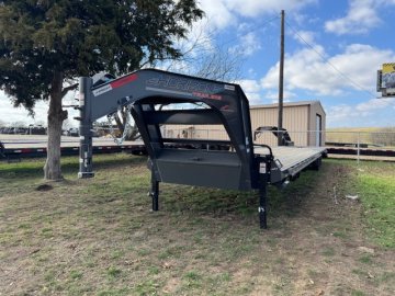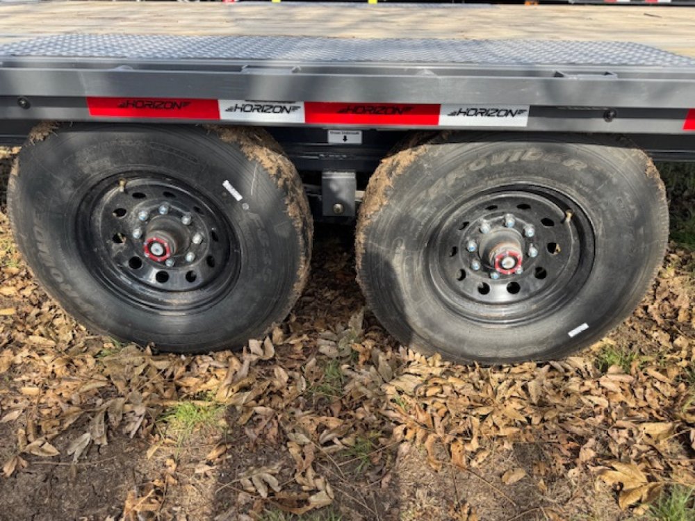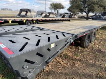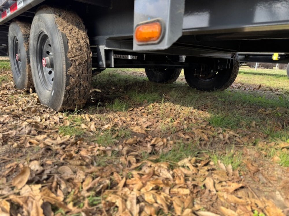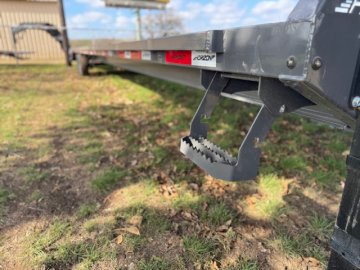 40' x 102" x 34" 8K FLATDECK TRAILER 5' Dovetail With 2 Mountain Ramps 2 - 8k Lippert Electric Brake Oil Bath Spring Axles Jack Handle With Roller Bearings Ratchet Slide Track Left Side 6 - 4" Sliding Ratchets SPARE
