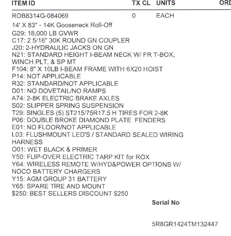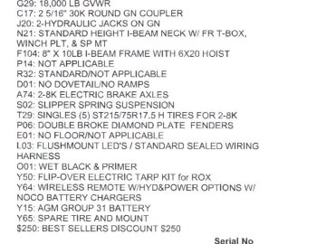 2 5/16" Ball, Adjustable Coupler, Gooseneck, Hydraulic Jack(s), Flip over Tarp, Spare Tire, Spare Tire Mount, Spring Suspension, Toolbox, Winch Plate, 18 Ply Tires