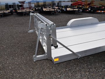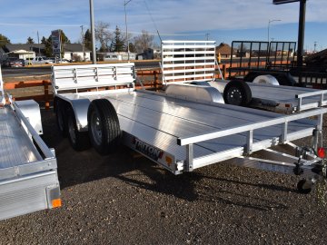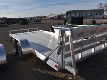 Triton 81"X16' 7K Aluminum Utility Trailer (Fit Series) extruded alum decking, torsion axles, silver mod wheels, ST205/75R14 tires, spare tire, LED lights, HD bi-fold ramp, 4 quick slide tie down D-rings, 5 quick slides, tongue jack, wheel stop front rail