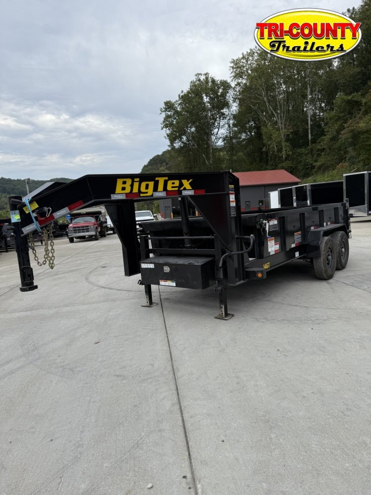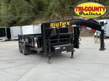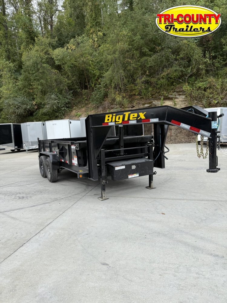 2026 Big Tex 14GT-14 14GT Heavy Duty Telescopic Gooseneck Dump Trailer Delivering rock-solid hauling performance for professionals in construction and landscaping, the 14GT Heavy Duty Telescopic Gooseneck Dump is built from the ground up to offer superior (and smoother) lift for any load. How? With its heavy-duty gooseneck and 12-ton, 3-stage telescopic hydraulic cylinder, that's how. This gooseneck dump trailer handles large, bulky cargo and debris-even uneven or loose materials-with ease, thanks to its advanced engineering and design. A feature-packed dump box comes loaded with an integrated crank-style tarp shroud and tarp, D-ring tie downs, and a rear combo gate to make sure heavy-duty haulers are equipped for whatever the workday brings. Info Industry Trailer Make Big Tex Model 14GT-14 Trim Base Year 2026 Msrp 14544 Price 12350 Stock Number 35993 Category Dump Trailer Subcategory Dump Trailer Condition New Location Charleston Vin 16V3D2227T5435993 Dry Weight 4650 Color Black Hitch Type Gooseneck Axles 2-7,000# Quick Lube w/electric brakes Length 14' Width 83" Height 24 ' Suspension Multi Leaf Spring w/Equalizer Tires 235/80/16 LRE Rear Door Combo Gate Barn Doors and Spreader Gate Floor 10GA SHEET METAL FLOORS Gvwr 15900 Axle Capacity 2-7000 Payload Capacity 11250 Specifications GVWR15900 lbsDry Weight4650 lbsMax Load11250 lbsLength14'Width83"TongueLength: 51-1/8" | 10" I-Beam NeckAxles2 - 7,000# Premium, Cambered Axles with Quick-Lubricating HubsBrakesForward Self-Adjusting Electric Brakes on Both AxlesSuspensionMulti-Leaf Slipper Spring w/ EqualizerFrame8" I-Beam (13#)LightsRecessed, Grommet-Mounted L.E.D. LightingTiresST235/80 R-16 Load Range E Radial TiresWheelsBlack Mod SteelCouplerRound Adjustable Pin 2-5/16" Gooseneck CouplerSafety Chains3/8" Grade 70 w/ Safety Latch Hook (2 ea)Crossmembers3" Channel on 16" CentersFloor10 Gauge Smooth SteelFenders9" x 72" 14 Ga. Diamond Plate Double BrokeFinishProfessional Finish w/ Primer StandardBattery12V Deep CycleGate/DoorRear Combo Gate (Barn Doors & Spreader Gate)StepConvenient Side-Step to Access Top RailTop Rail3"x 2" Rectangular Tubing