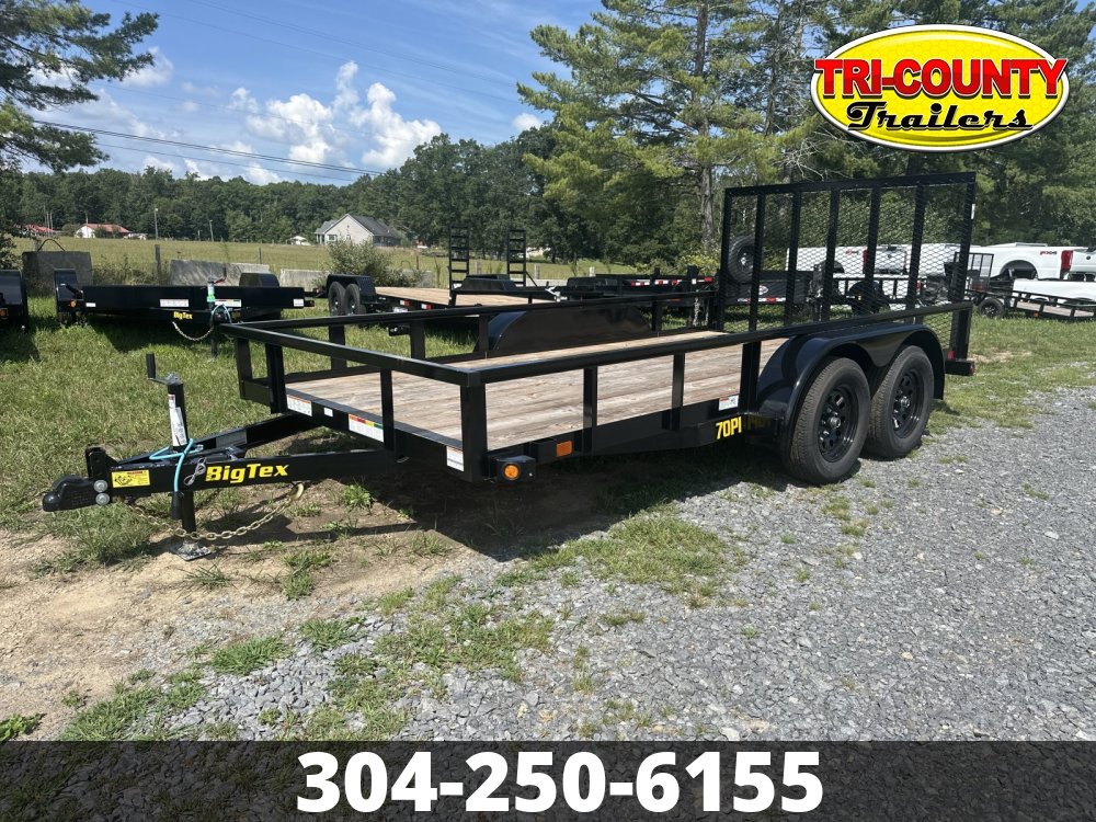 2026 Big Tex 70PI-14 70PI Tandem Axle Pipe Utility Trailer When it comes to hauling light-duty equipment on the farm or ranch, there's nothing more versatile than the 70PI-X Tandem Axle Pipe Top Utility Trailer. Coming standard with an extra wide 83'' wide deck, this trailer is built to transport small equipment and other loads for agricultural applications. It's sturdy. It's durable. It's dependable. It's everything you need in a cost-effective-yet adaptable-utility trailer that gets the job done from sunrise till sunset. Info Industry Trailer Make Big Tex Model 70PI-14 Trim Base Year 2026 Msrp 4816 Price 3985 Stock Number 27794 Category Utility Trailer Subcategory Utility Trailer Condition New Location BEAVER Vin 16V1U1829T7427794 Dry Weight 1780 Color Black Hitch Type BUMPER 2-5/16 Axles 2-3500 Quick Lube w/(1) electric brakes Length 14' Width 83" Suspension Multi leaf Spring w/equalizer Wheels 15" Tires 205/75/15 LRC Rear Door 4" Tall Rear Ramp gate w/coil spring assist Floor 2" Treated Gvwr 7000 Axle Capacity 2-3500 Payload Capacity 5,220 Specifications GVWR7000 lbsDry Weight1780 lbsMax Load5220 lbsLengthBed: 14' | Tongue: 44-1/2"Width83"Axles2 - 3,500# Premium, Cambered Axles with Quick-Lubricating HubsBrakesElectric Brake on Front AxleSuspensionMulti-Leaf Spring w/ EqualizerCouplerAdjustable 2-5/16" Demco EZ LatchSafety Chains1/4" Grd. 30 w/ Safety Latch Hook (2 ea)Frame4" x 3" x 1/4" AngleCrossmembers3" x 2" x 3/16" AngleFloorTreated Pine FloorFenders9" x 72" Rolled Formed w/ BackRamps4' Tall 3-Way Ramp Gate w/ Coil Spring AssistLightsL.E.D. D.O.T. Stop, Tail, Turn & ClearanceTiresST205/75 R-15 Load Range CFinishProfessional Finish w/ Primer Standard