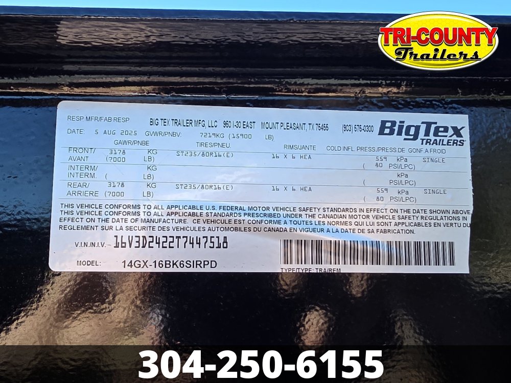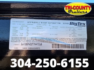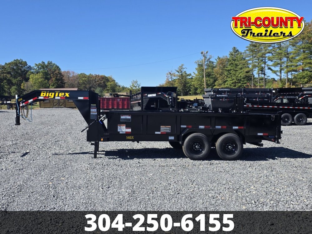 2026 Big Tex 14GX-16 14GX Heavy Duty Tandem Axle Gooseneck Dump For the ultimate in strength and durability, look to the 14GX Heavy Duty Tandem Axle Extra Wide Gooseneck Dump Trailer-from its robust and long-lasting structure and frame to heavy-duty dump box with 10-Gauge steel floors. Packed to the brim with the most complete box unit in the industry, the 14GX is designed to handle heavy-duty and extra wide loads with superior stability and efficiency. Info Industry Trailer Make Big Tex Model 14GX-16 Trim Base Year 2026 Msrp 15179 Price 12850 Stock Number 47518 Category Dump Trailer Subcategory Dump Trailer Condition New Location BEAVER Vin 16V3D2422T7447518 Dry Weight 4830 Color Black Hitch Type Gooseneck Axles 2-8000 Oil Bath W/Electric Brakes Length 16' Width 83" Height 24" Suspension Multi leaf Spring w/equalizer Tires 235/80/R-16 Load Range E Rear Door Combination Barn Door Spreader Gate Floor 10GA SHEET METAL FLOORS Gvwr 15900 Axle Capacity 2-8000 lbs Payload Capacity 11080 Specifications GVWR15900 lbsDry Weight5000 lbsLengthBed: 16'Width83"TongueLength: 51-1/8" | 8" Seamless I-Beam Integrated w/ Frame (10#)Axles2 - 7,000# Premium, Cambered Axles with Quick-Lubricating HubsBrakesForward Self-Adjusting Electric Brakes on Both AxlesSuspensionMulti-Leaf Slipper Spring w/ EqualizerCouplerRound Adjustable Pin 2-5/16" Gooseneck CouplerSafety Chains3/8" Grade 70 w/ Safety Latch Hook (2 ea)Frame8" I-Beam (10#)Crossmembers3" Channel on 16" CentersFloor10 Gauge Smooth SteelFenders9" x 72" 14 Ga. Diamond Plate Double BrokeLightsRecessed, Grommet-Mounted L.E.D. LightingTiresST235/80 R-16 Load Range E Radial TiresWheelsBlack Mod SteelBattery12V Deep CycleGate/DoorRear Combo Gate (Barn Doors & Spreader Gate)StepConvenient Side-Step to Access Top RailTop Rail3"x 2" Rectangular TubingFinishProfessional Finish w/ Primer StandardMax Load10900 lbs