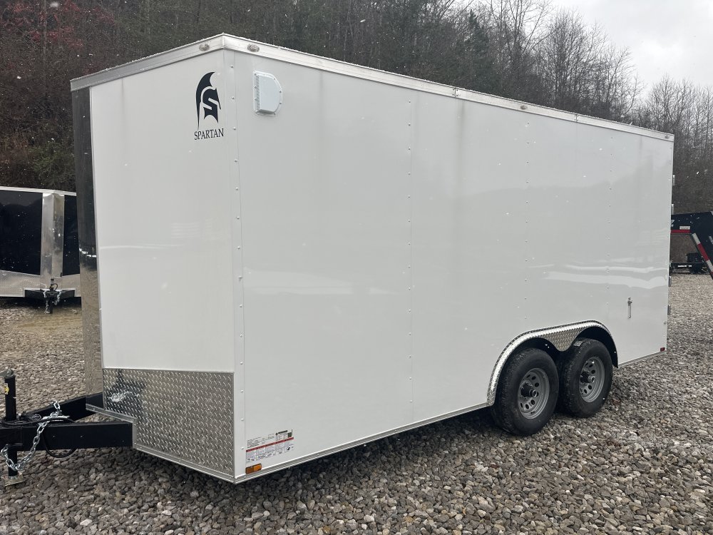 2026 Spartan Cargo Trailers 8.5' x 16' Tandem Axle Info Industry Trailer Make Spartan Cargo Trailers Model 8.5' x 16' Tandem Axle Trim Base Year 2026 Msrp 10930 Price 8895 Stock Number 53771 Category Cargo Trailer Subcategory Cargo Trailer Condition New Location Charleston Vin 50XBE1623TA053771 Color White .030 Length 16' Gvwr 10000 Specifications Width8.5'Frame6" Tubing FrameFendersAluminum Teardrop Fender FlairsTires15" 205 Radial TiresWalls3/8" Plywood wallsRampsBarn DoorCoupler2 5/16"Crossmembers16" OC Floor Cross MembersHeightInterior: 78"LightsLEDFloor¾" Plywood FloorsWheelsGrey Mod WheelsAxles5000# Leaf Spring Drop Brake Axles W EZ Lube HubsD-Rings4 Floor Mounted D-RingsLength16'