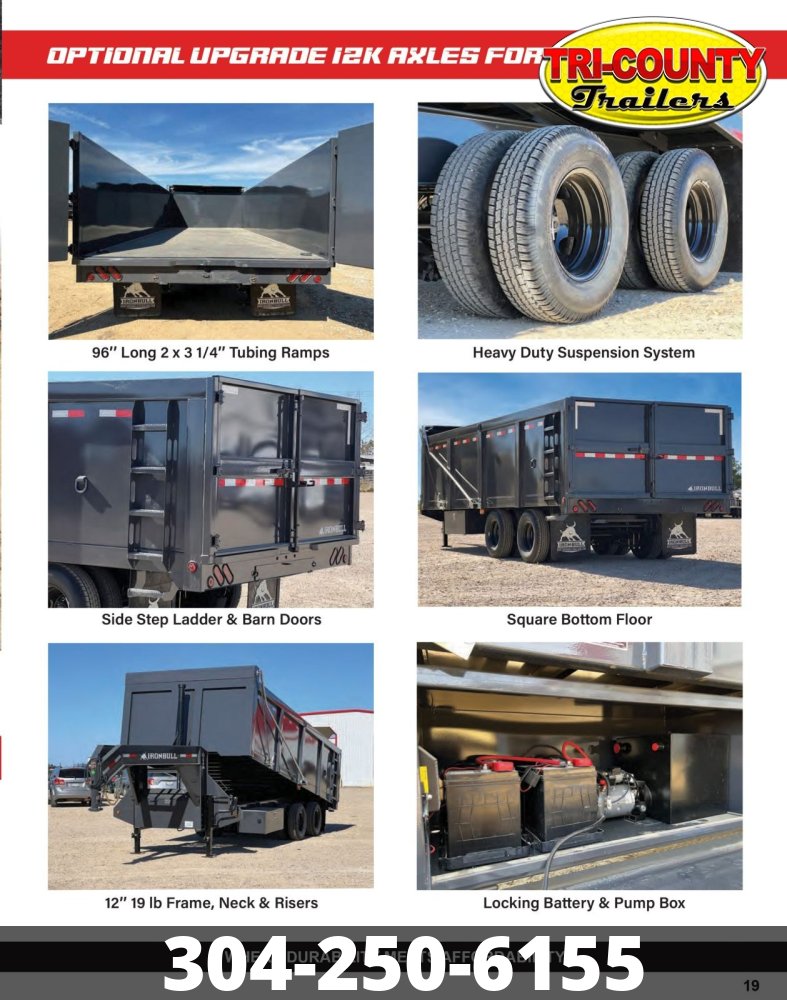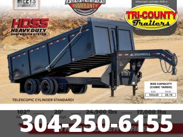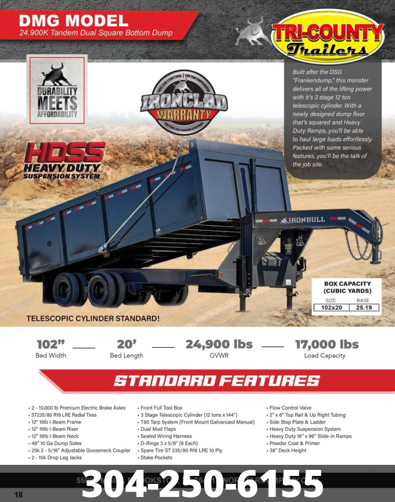 2026 Iron Bull Trailers DMG22 Built after the DSG "Frankendump," this monster delivers all of the lifting power with it's 3 stage 12 ton telescopic cylinder. With a newly designed dump floor that's squared you'll be able to load the biggest of equipment ever. Packed with some serious features, you'll be the talk of the job site. Features May Include: 2 - 10,000 lb Premium Electric Brake Axles. ST235/80 R16 LRE Radial Tires 12" 19|b I-Beam Frame 12" 19lb I-Beam Riser 12" 19lb I-Beam Neck 48" 10 Ga Dump Sides. 25k 2 - 5/16" Adjustable Gooseneck Coupler 2 - 10k Drop Leg Jacks Front Full Tool Box 3 Stage Telescopic Cylinder (12 tons X 144"). T80 Tarp System (Front Mount Galvanized Manual) Dual Mud Flaps Sealed Wiring Harness D-Rings 3 x 5/8" (8 Each) Spare Tire ST 235/80 R16 LRE 10 Ply Stake Pockets Flow Control Valve 2" x 6" Top Rail & Up Right Tubing Side Step Plate & Ladder Heavy Duty Suspension System Heavy Duty 16" x 96" Slide-in Ramps. Powder Coat & Primer 38" Deck Height 7 Ga flooring Info Industry Trailer Make Iron Bull Trailers Model DMG22 Trim Base Year 2026 Msrp 26872 Price 23999 Stock Number 10671 Category Dump Trailer Subcategory Dump Trailer Condition New Location BEAVER Vin 50HDG2025T1910671 Length 20' Specifications Width102Length20GVWR24,900Axles2 x 10,000 lbTiresST235Wheels80R16Max Load17,000